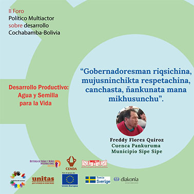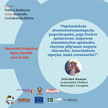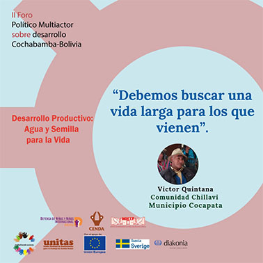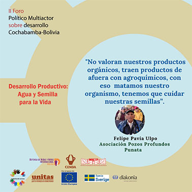 El pasado 12 y 13 de julio en la ciudad de Cochabamba se realizó el II Foro Político Multiactor sobre Desarrollo Productivo: Agua y Semilla para la Vida. Evento que ha reunido a pequeños productores campesinos y regantes de los Valles y la zona Andina de Cochabamba, quienes han analizado y debatido sobre los avances y obstáculos del cumplimiento de los Objetivos de Desarrollo Sostenible (ODS), del Plan Nacional de Desarrollo Económico y Social 2016-2020, la Agenda Patriótica 2025 y otras normativas nacionales, en los temas agua para riego y semillas nativas.